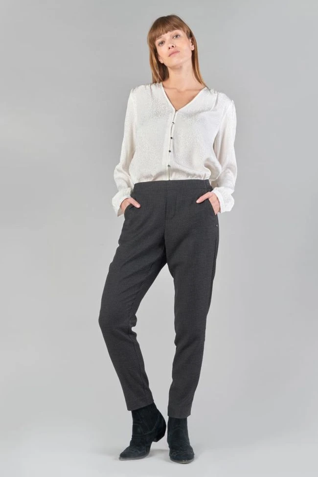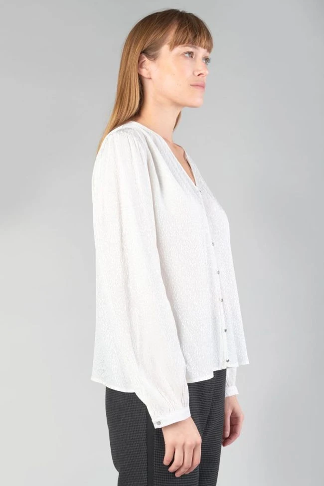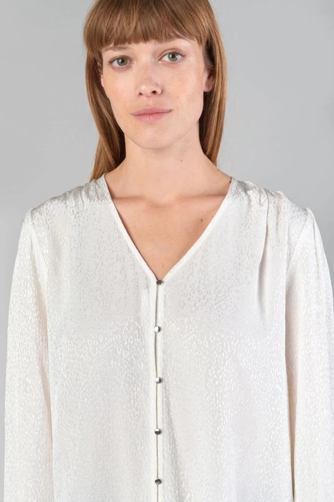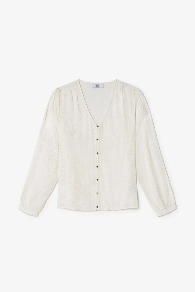 Cette blouse Frano donnera à vos tenues un look féminin élégant avec son jacquard crème, son col V, et ses épaules légèrement plissées.