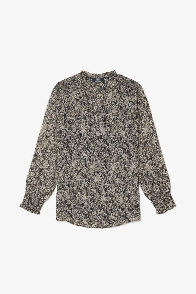 Cette blouse Melody vous donnera un look habillé avec son voile léger et fluide à motif fleuri beige parsemé de touches brillantes, ses épaules smockés et son col ruffle habillé de liens pour ajuster l’ouverture. Pour plus de confort, les poignets sont élastiqués et l’avant de la blouse est doublé.