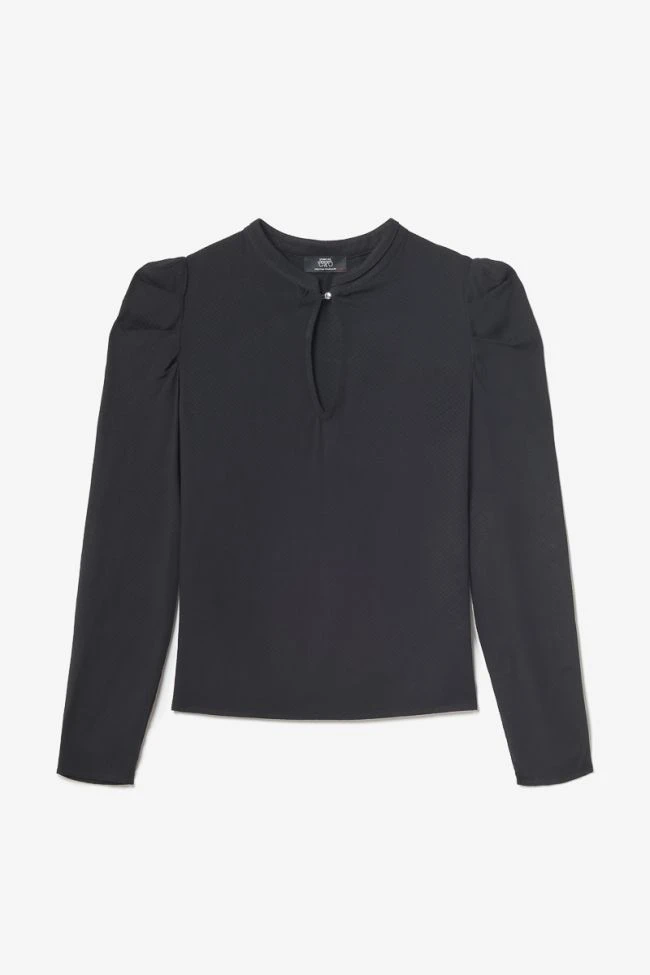 Cette blouse Sterenn est un intemporel du dressing féminin avec son jacquard noir doux, ses manches bouffantes au niveau des épaules et son col en goutte avec bouton argenté.