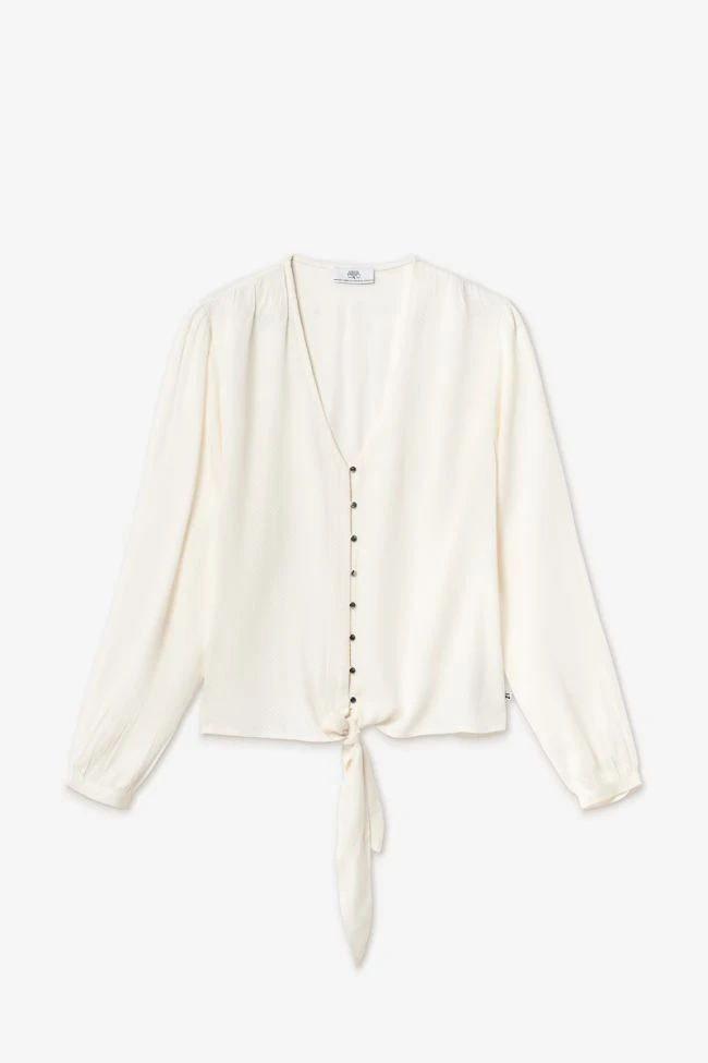 Cette blouse Tala est féminine avec son jacquard crème et ses boutons argentés, mais également tendance avec ses liens à nouer à l’avant sur le bas.