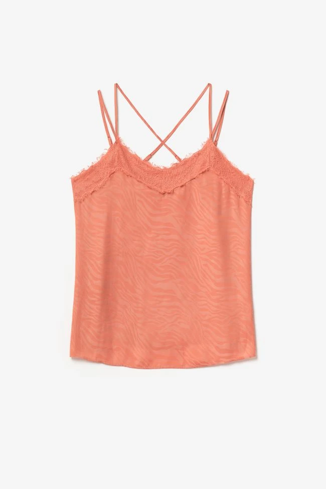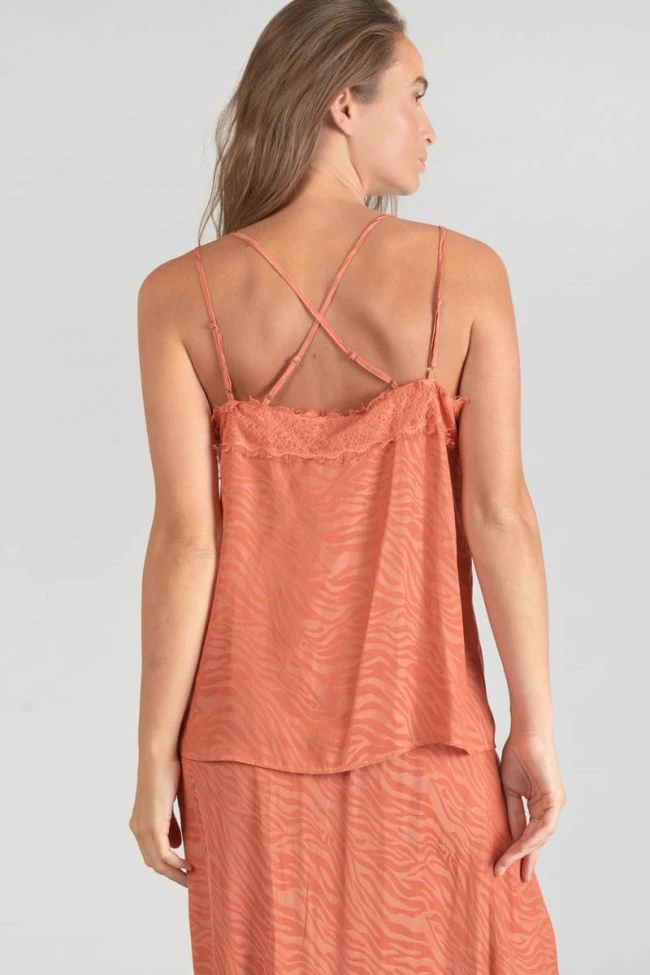 Ce caraco Ayek est très féminin et raffiné grâce à son jacquard fluide au motif zébré et son encolure en dentelle à l’avant et à l’arrière. Pour plus de style, ses fines bretelles sont doubles et croisées dans le dos, et pour plus de confort, ces dernières sont réglables.