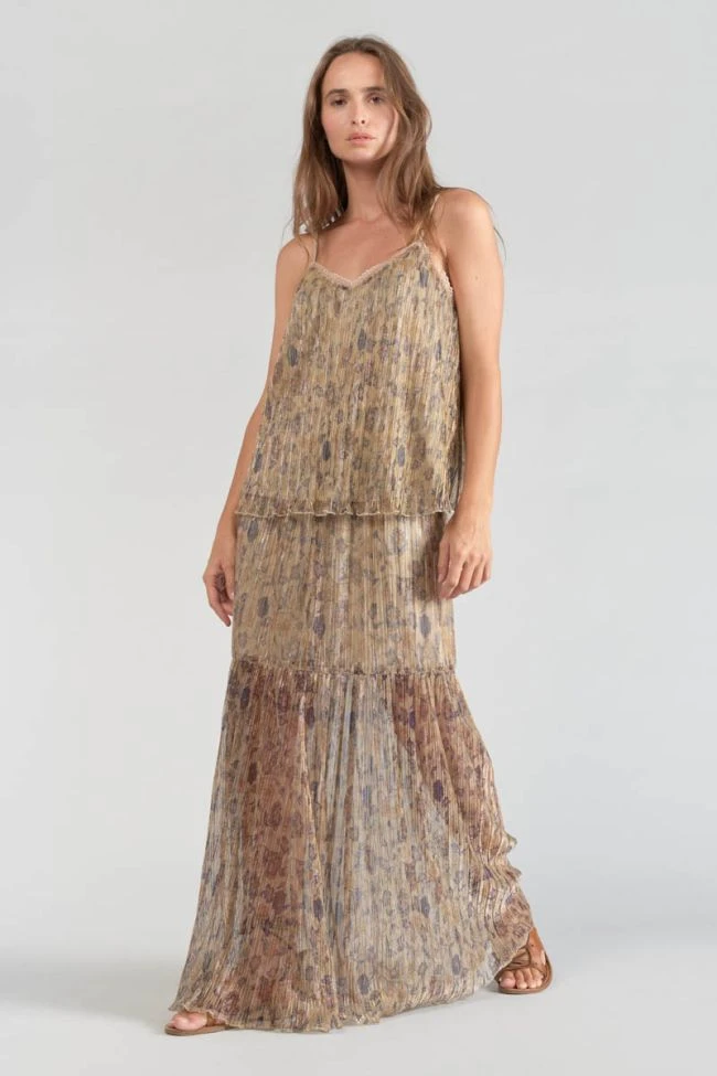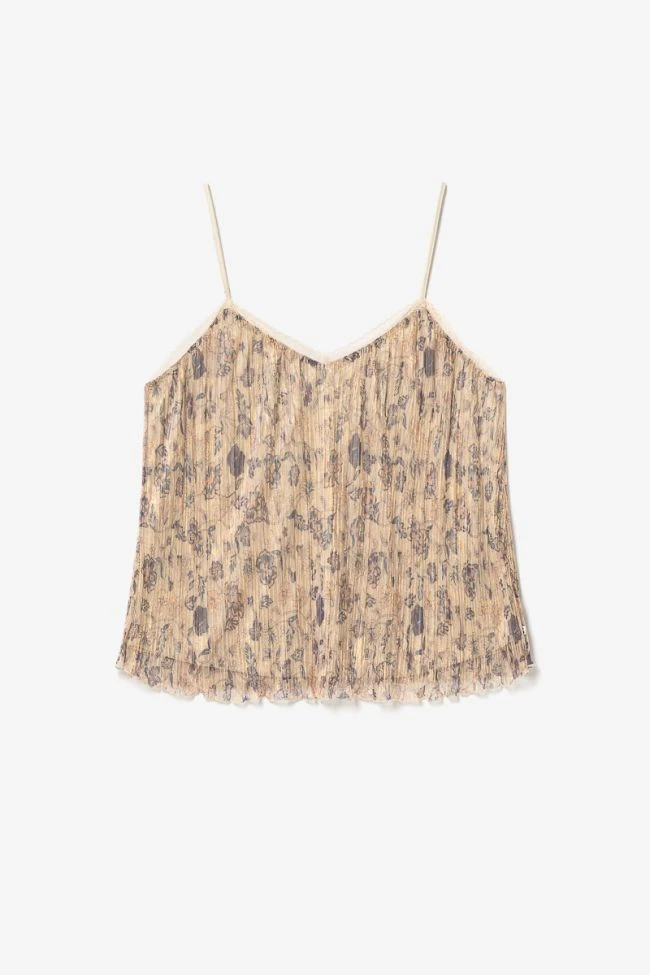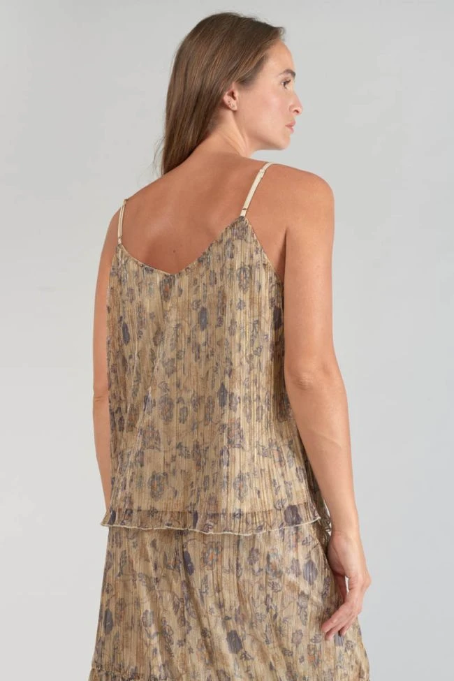 Ce caraco Kava vous donnera un look féminin élégant avec son tissu plissé doré à motif fleuri et sa fine dentelle au niveau de l’encolure à l’avant. Pour plus de confort, les fines bretelles sont réglables et le top est doublé.