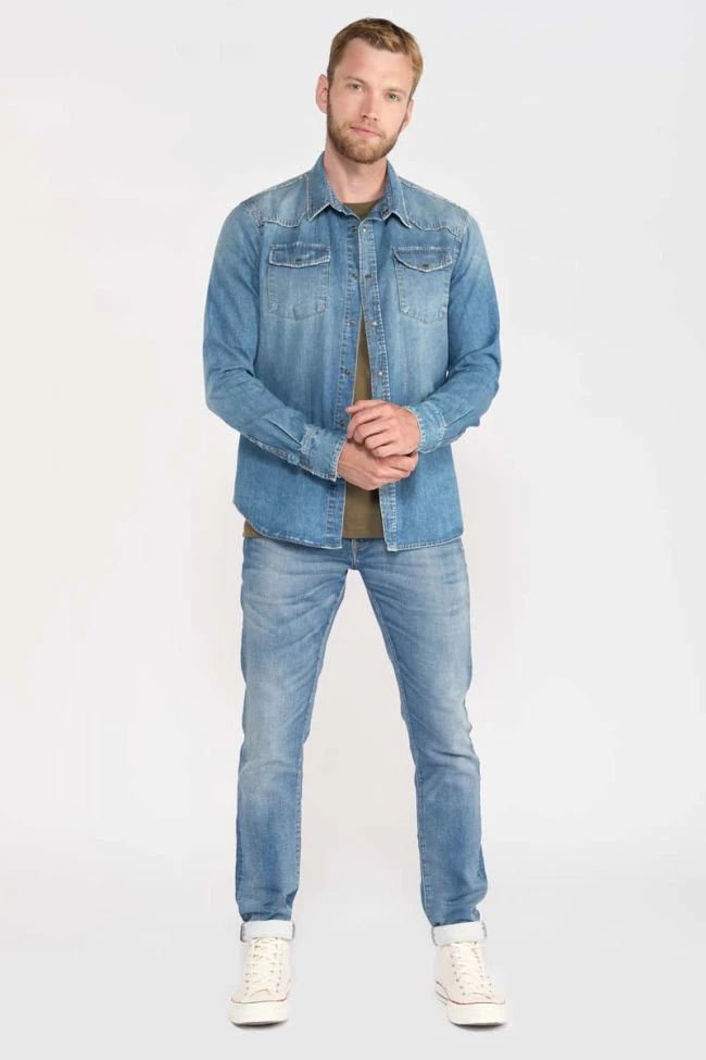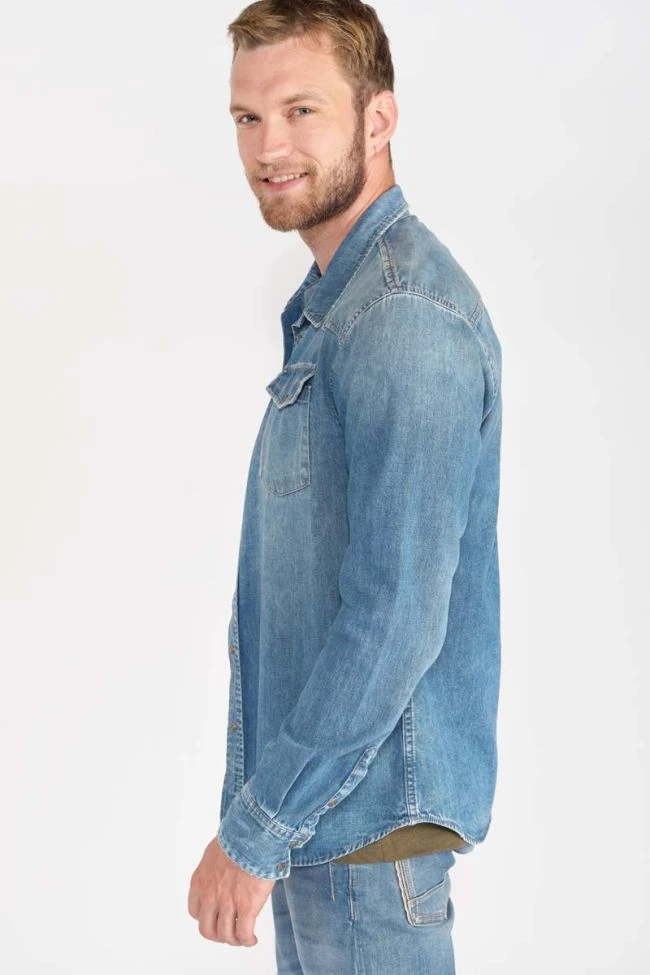 Cette chemise Juanito en jeans bleu vous donnera un look tendance et branché grâce à ses abrasions, son délavage et ses boutons pressions.