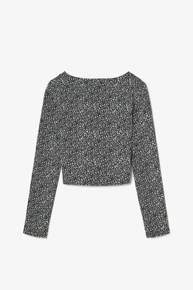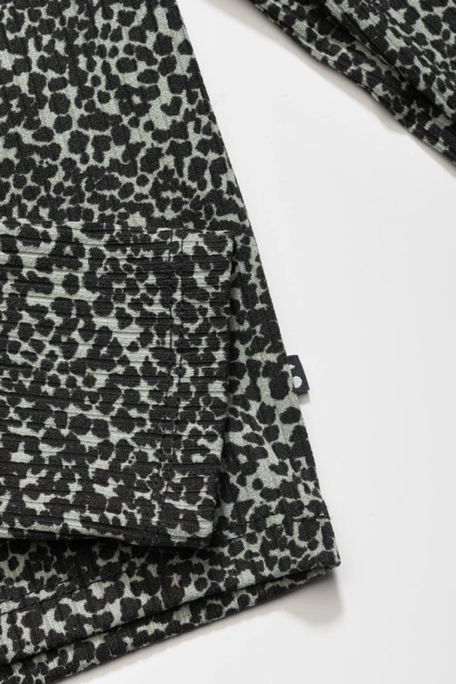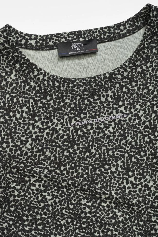 Crop top Besgi à manches longues très tendance et girly avec sa coupe courte, son tissu côtelé stretch, son motif léopard vert et noir, ainsi que son inscription « Le Temps des Cerises » grise en relief.