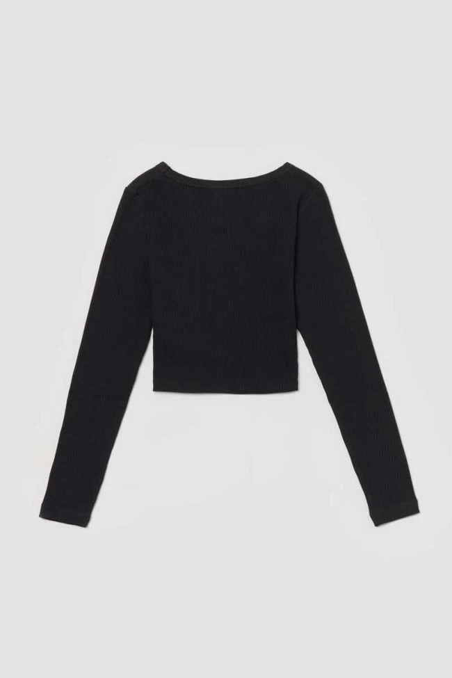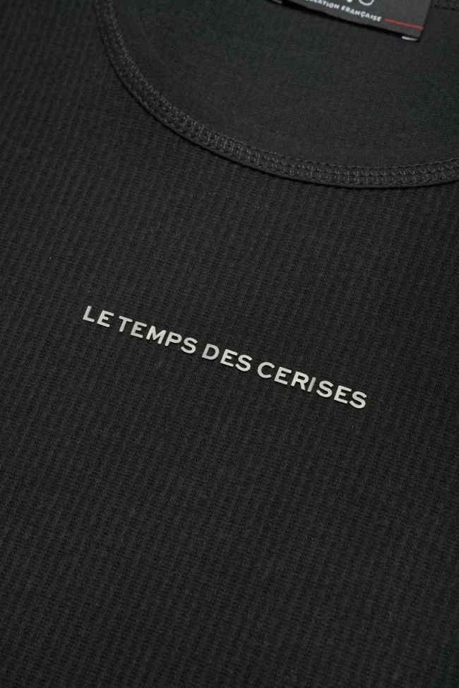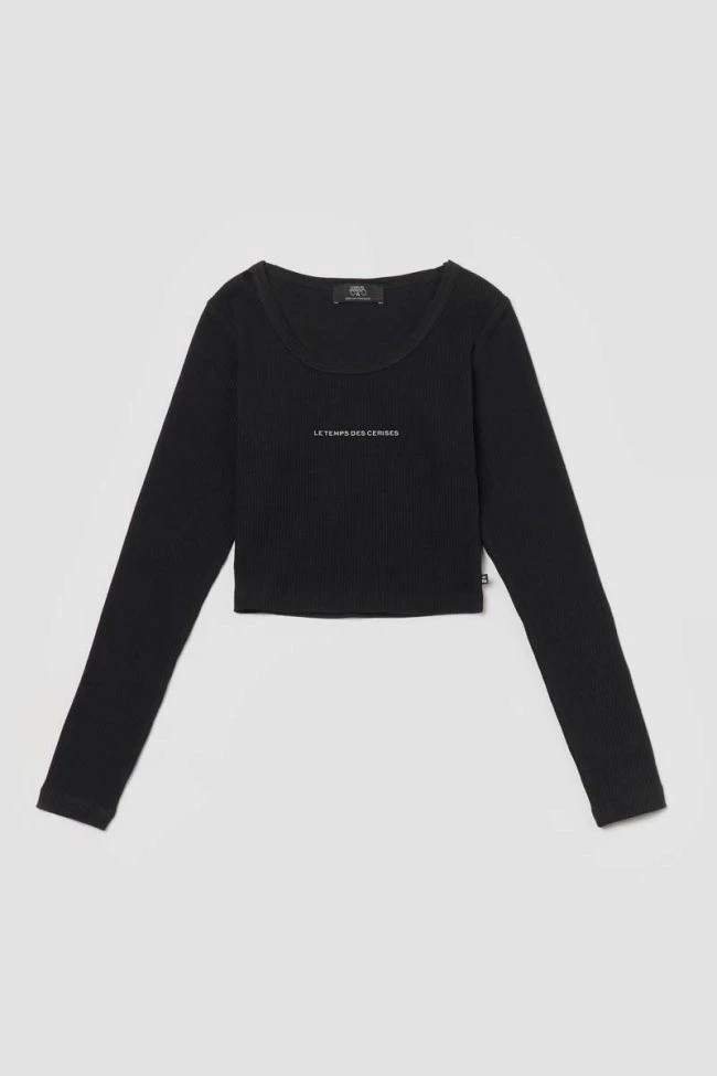 Crop top noir au tissu côtelé manches longues stretch inscription « Le Temps des Cerises » argenté en relief.