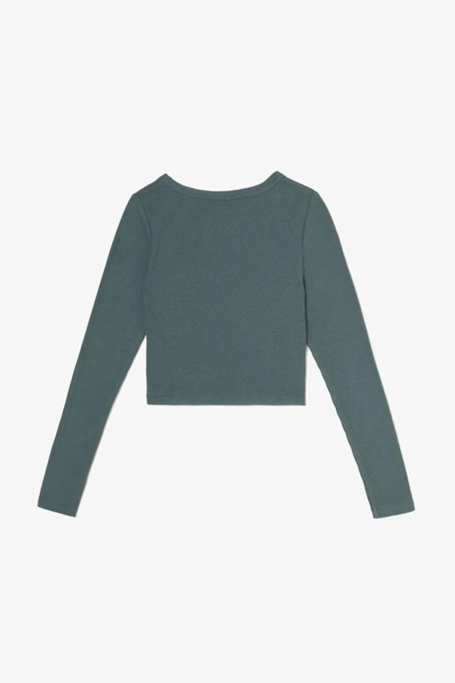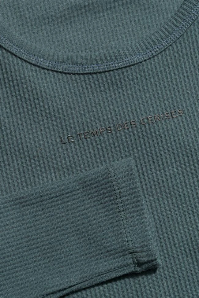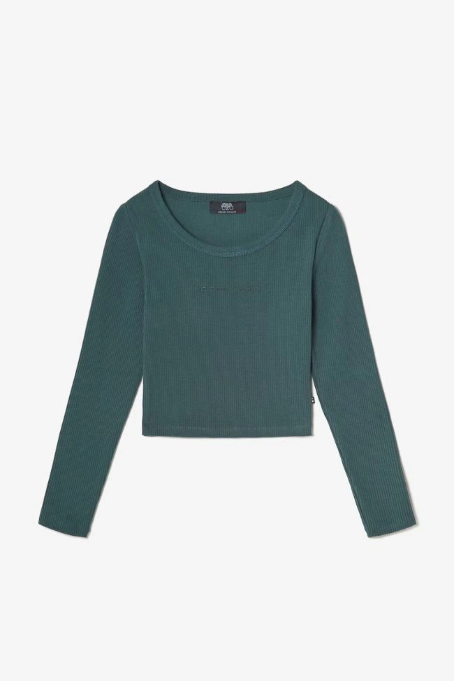 Crop top vert bouteille au tissu côtelé manches longues stretch inscription « Le Temps des Cerises » noir en relief.