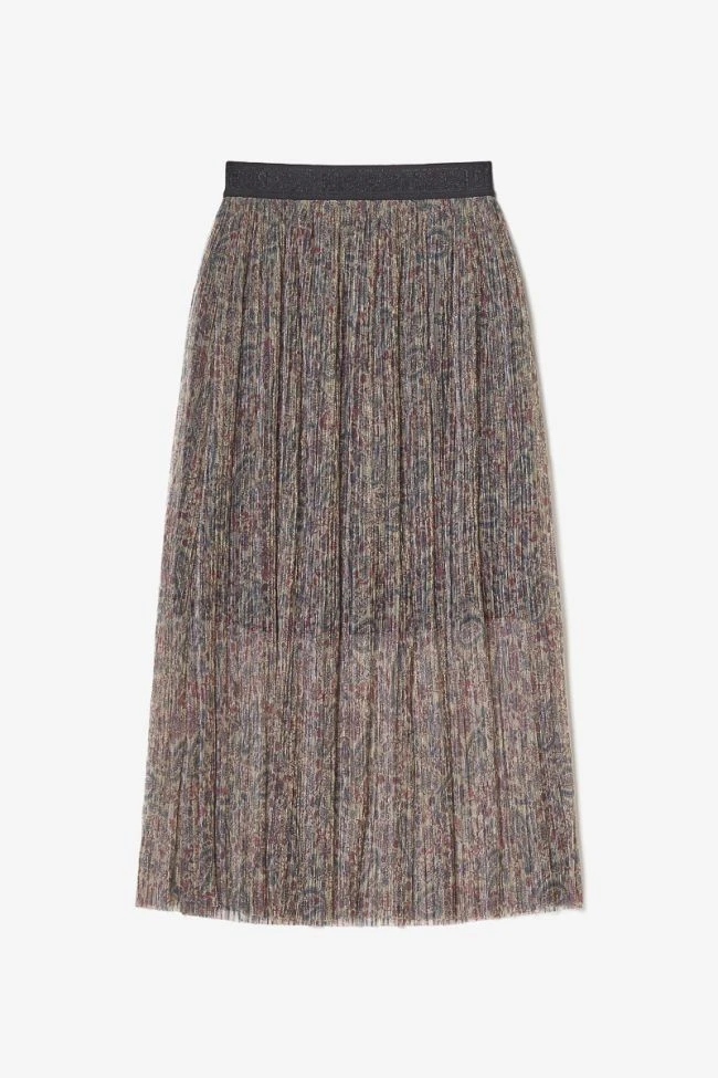 Jupe longue Aresgi très tendance et festive grâce à son tissu plissé à motif cachemire irisé doré. Pour plus de confort, la jupe est doublée jusqu’aux genoux et la ceinture est élastiquée et personnalisée Le Temps des Cerises en fils brillants noirs.
