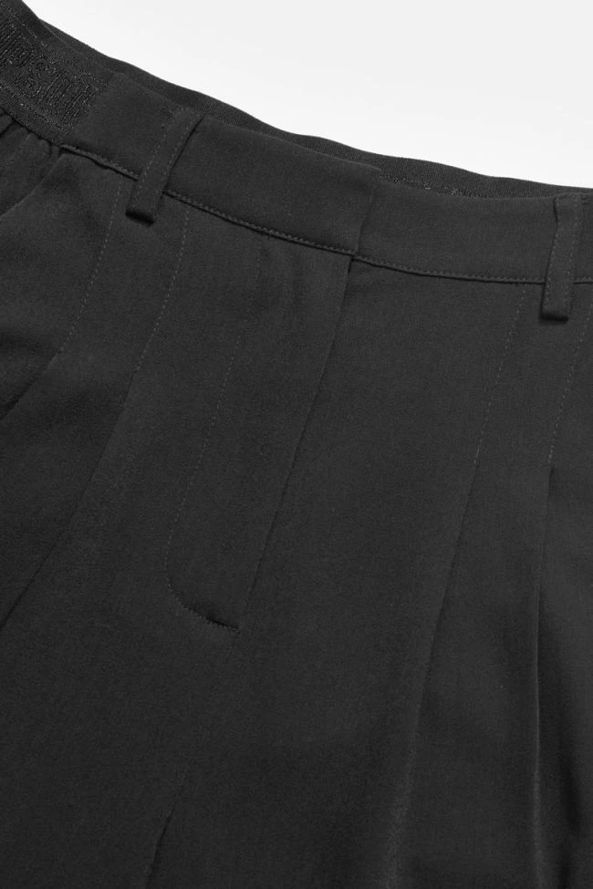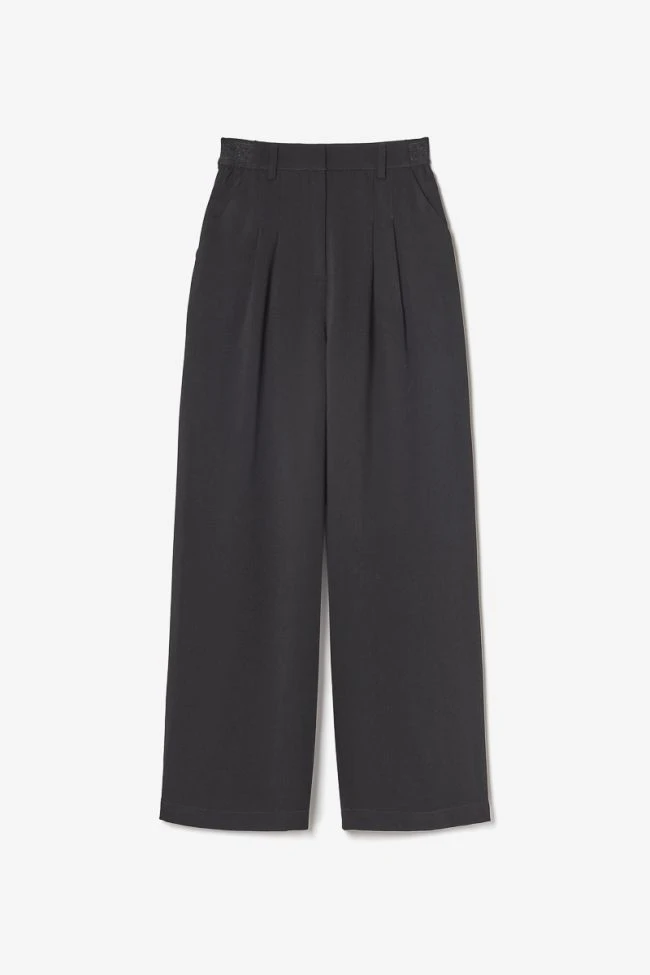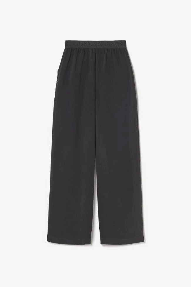 Pantalon Rellgi au look Ă©lĂ©gant et Ă la pointe de la mode avec son tissu fluide noir, sa coupe large accompagnĂ©e de plis au niveau de la taille pour donner du volume et ses poches italiennes. Pour plus de style, la taille est haute et sa ceinture Ă©lastiquĂ©e Ă l’arriĂšre est personnalisĂ©e « Le Temps des Cerises » avec des fils brillants noirs.