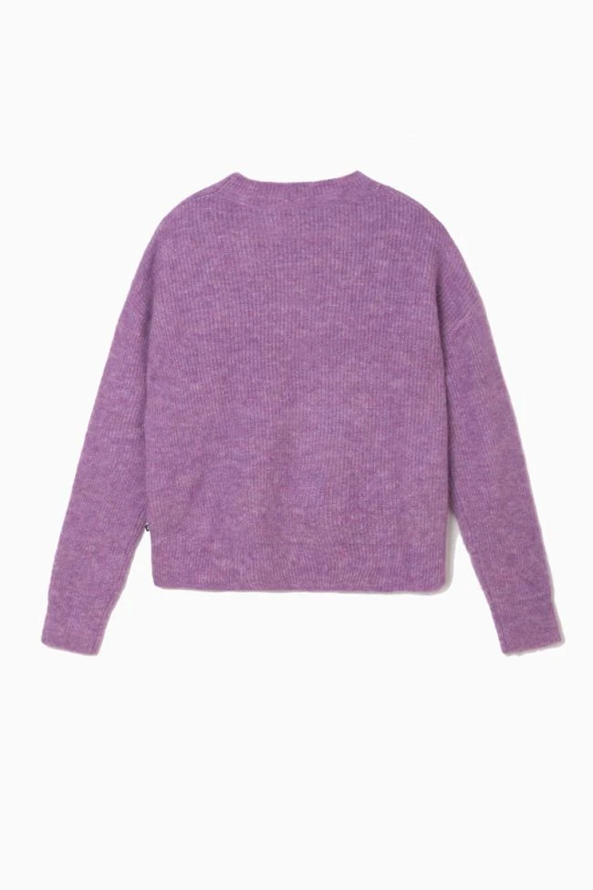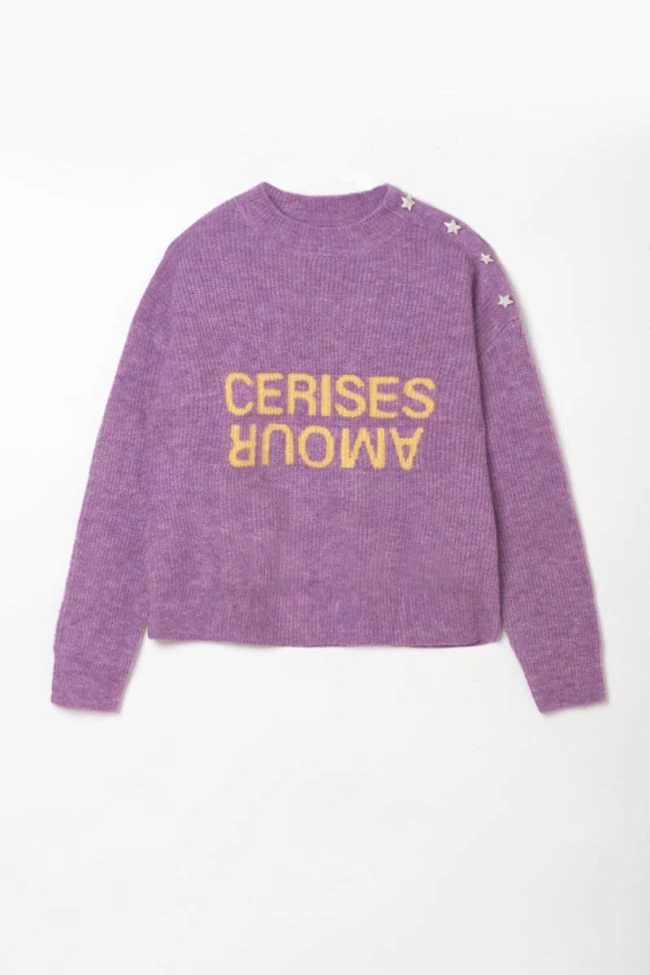 Pull Symchagi trĂšs tendance et girly avec sa couleur lila, son inscription en jacquard jaune ainsi que ses boutons bijoux en forme d’Ă©toile au niveau de l’Ă©paule gauche. Sa maille douce et chaude est agrĂ©able Ă porter.