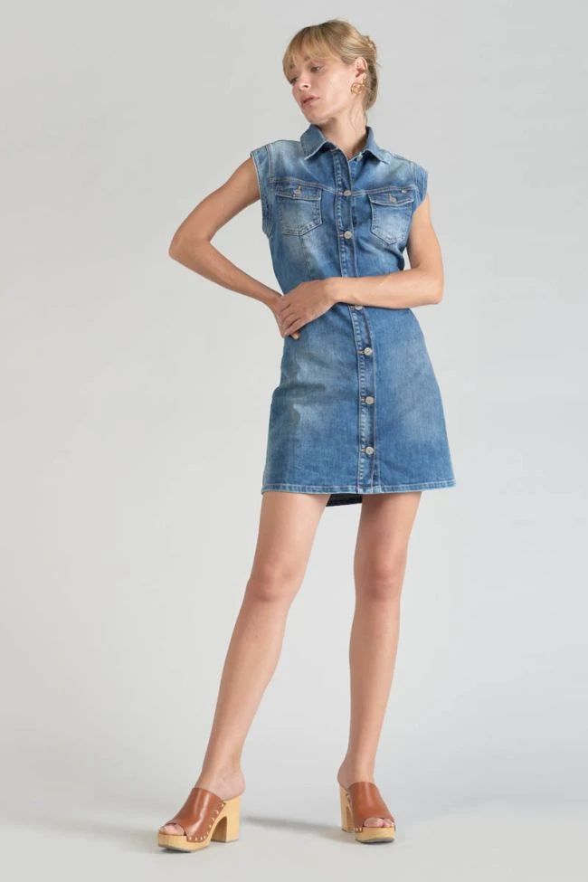 Cette robe sans manches Diderot en jeans bleu est un intemporel du dressing fĂ©minin avec sa coupe droite, son boutonnage visible argentĂ© et ses deux poches poitrine boutonnĂ©es. C’est la piĂšce idĂ©ale pour l’Ă©tĂ©.