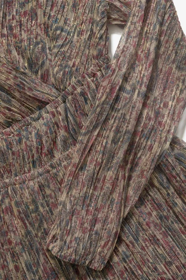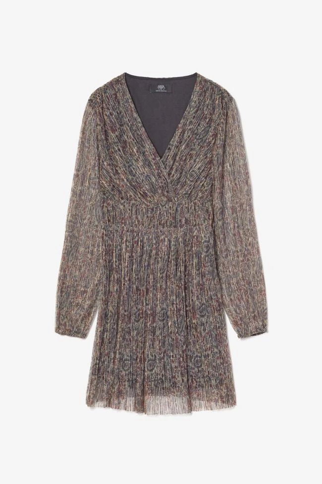 Robe Kodigi féminine et festive avec son tissu à motif cachemire plissé et irisé doré, sa taille élastiquée et son encolure croisée maintenu par un bouton pression. Pour plus de confort, la robe est doublée.