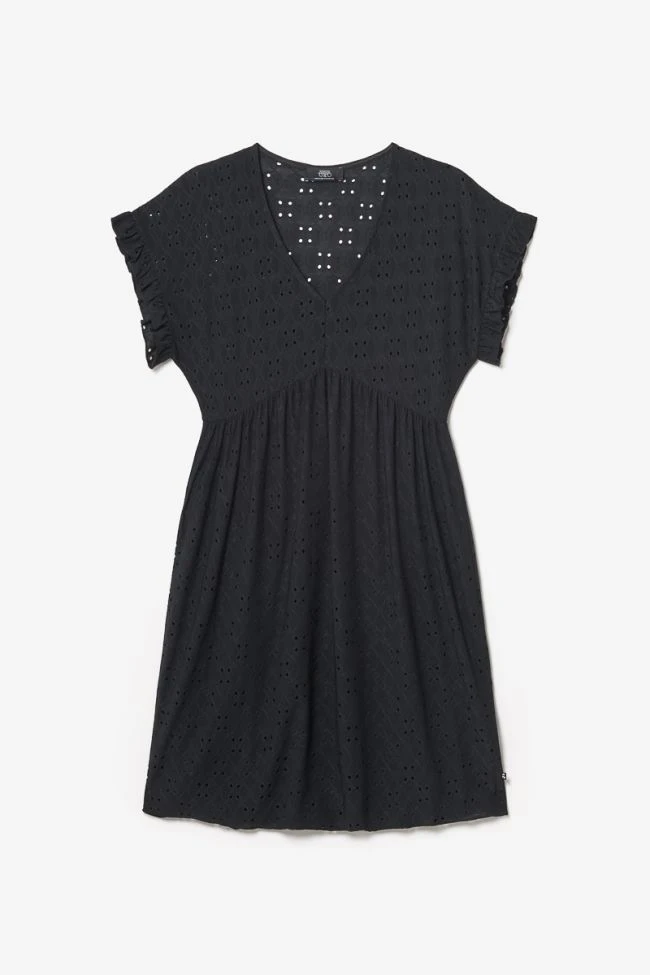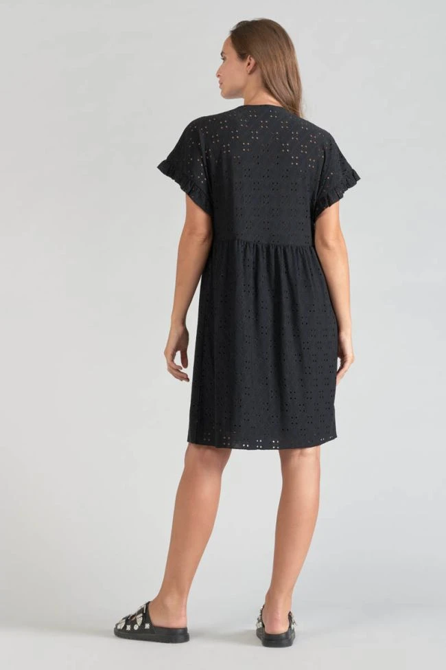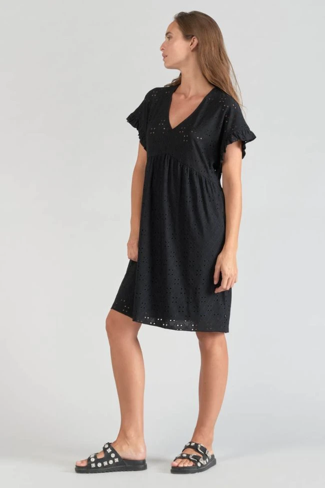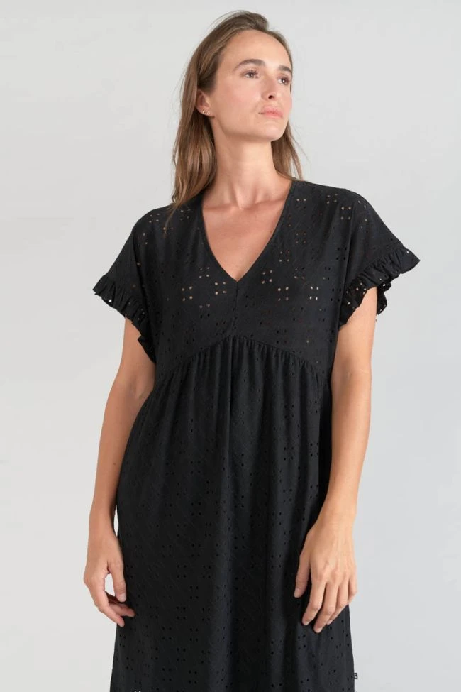 Cette robe Lia est très élégante avec son jersey noir à l’effet broderie anglaise pour donner un effet dentelle, son col V et ses volants en bas de manches. Pour plus de confort, la robe est doublée sur la partie basse.