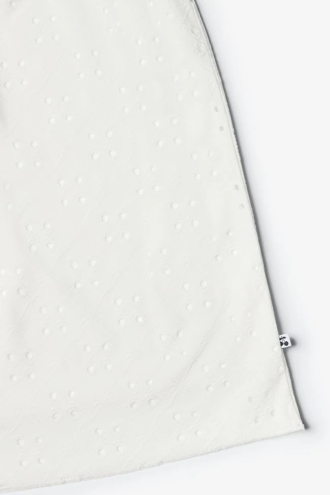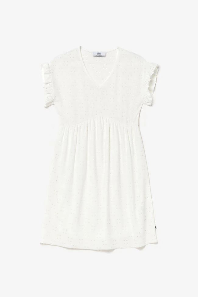 Robe Liagi très élégante avec son jersey blanc ajouré pour donner un effet dentelle, son col V et ses volants au niveau des épaules. Pour plus de confort, la robe est doublée sur la partie basse.
