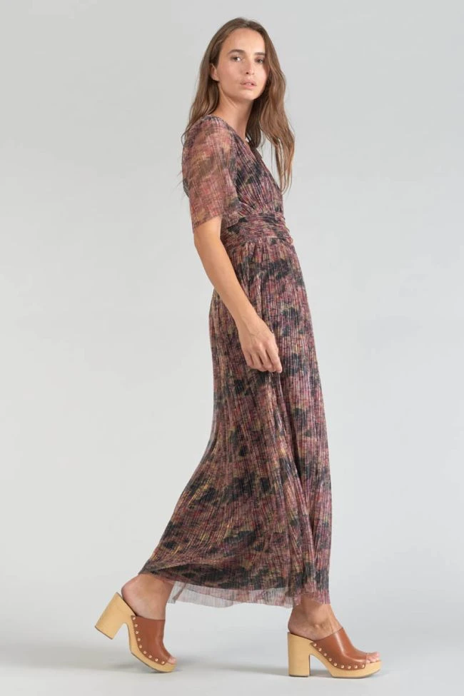 Cette robe longue Amiel est idéale pour vos soirées habillées avec son tissu plissé à l’imprimé original irisé, sa taille drapée pour mettre en valeur la poitrine, ses manches courtes transparentes et son col en V très féminin. Pour plus de confort, une fermeture zippée invisible sur le côté, un crochet pour ajuster l’ouverture du col et une doublure sur toute la longueur.