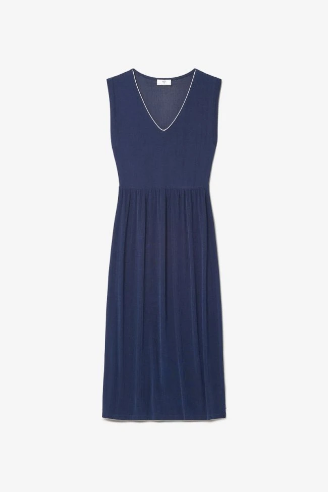Cette robe Nata sans manches est très élégante et raffinée avec sa coupe longue, son tissu bleu marine légèrement brillant et son liseré argenté au niveau du col . Pour plus de confort, le tissu doux et fluide est agréable à porter.