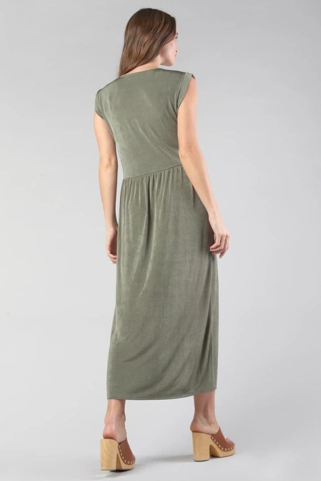 Cette robe Nata sans manches est très élégante et raffinée avec sa coupe longue, son tissu kaki légèrement brillant et son liseré doré au niveau du col. Pour plus de confort, le tissu doux et fluide est agréable à porter.