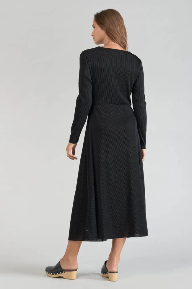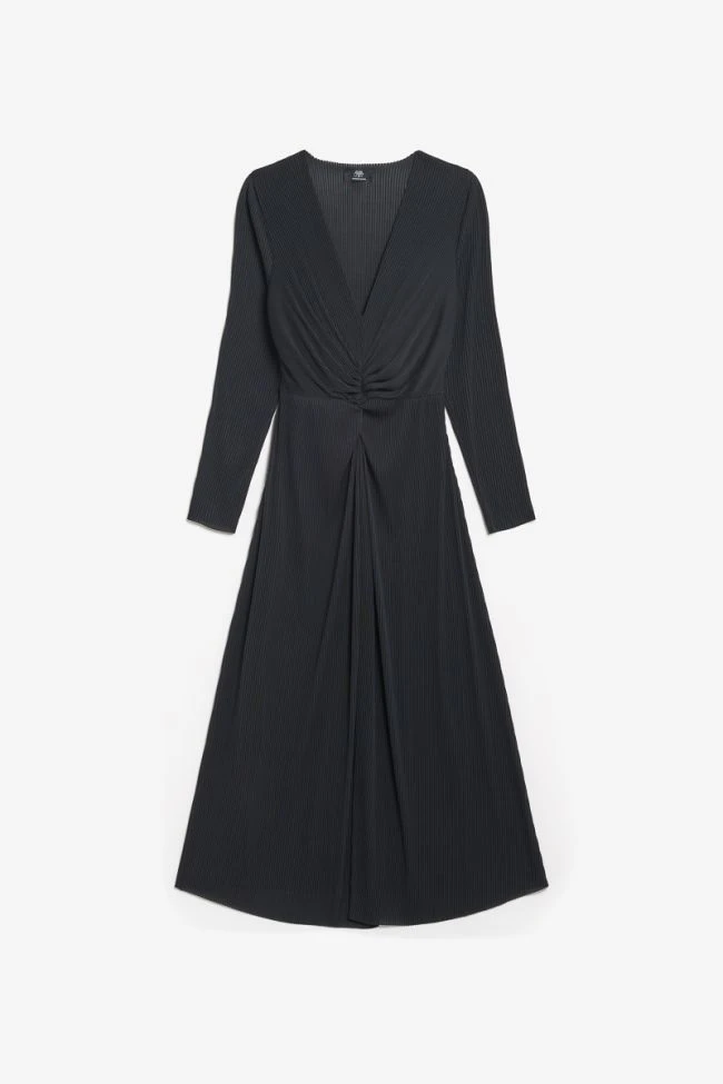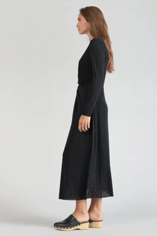 Cette robe Yama est parfaite pour être élégante et féminine lors de vos soirées avec sa coupe longue, son tissu noir plissé très raffiné, et son jeu de fronces au niveau de la taille.