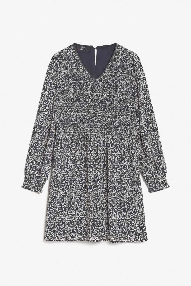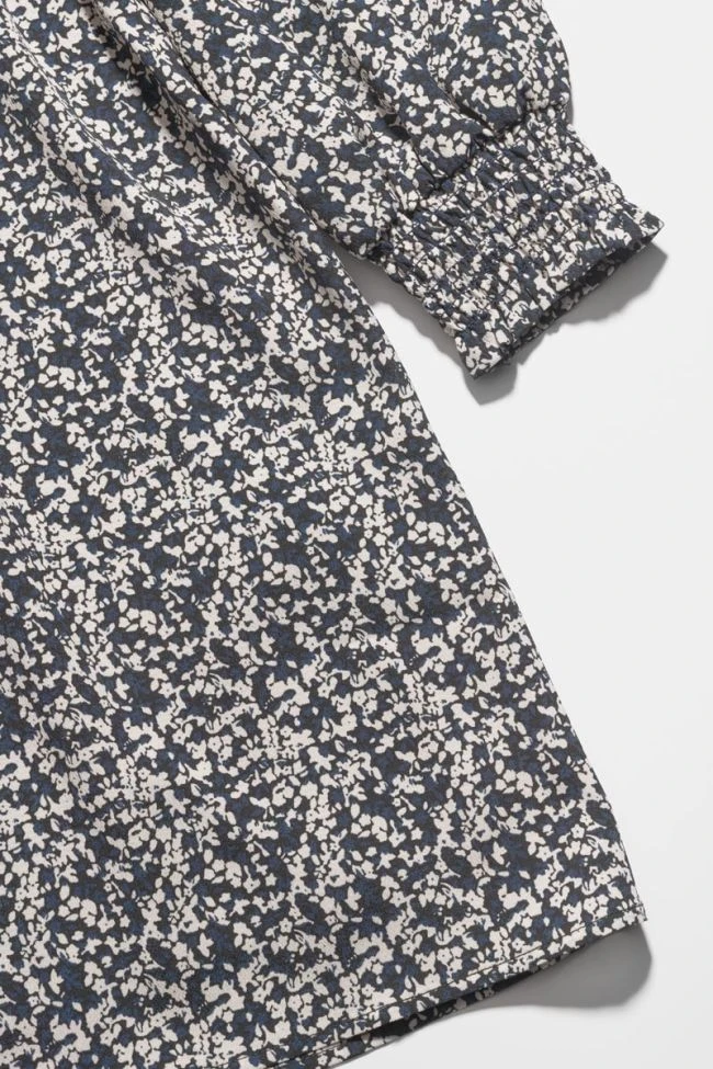 Robe Meyagi très raffinée avec son motif floral bleu nuit et blanc, son encolure habillée d’un joli liseré argenté, ses manches bouffantes et ses poignets smockés. Pour plus de confort, une ouverture goutte fermée par un bouton dans le dos et une doublure complètent la pièce.