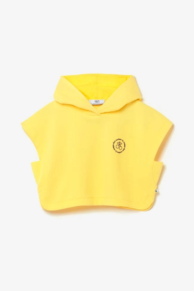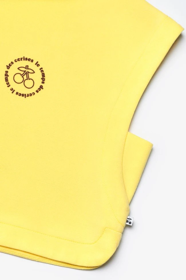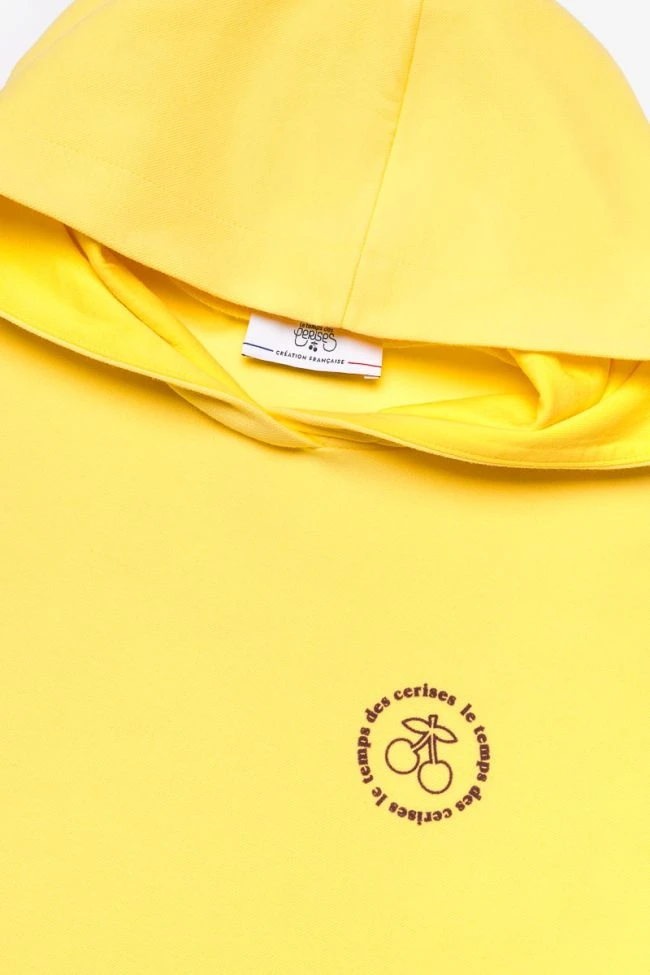 Sweat à capuche Shergi très tendance avec sa coupe loose courte et idéal pour la saison estivale avec sa couleur jaune et son imprimé personnalisé Le Temps des Cerises à l’avant.