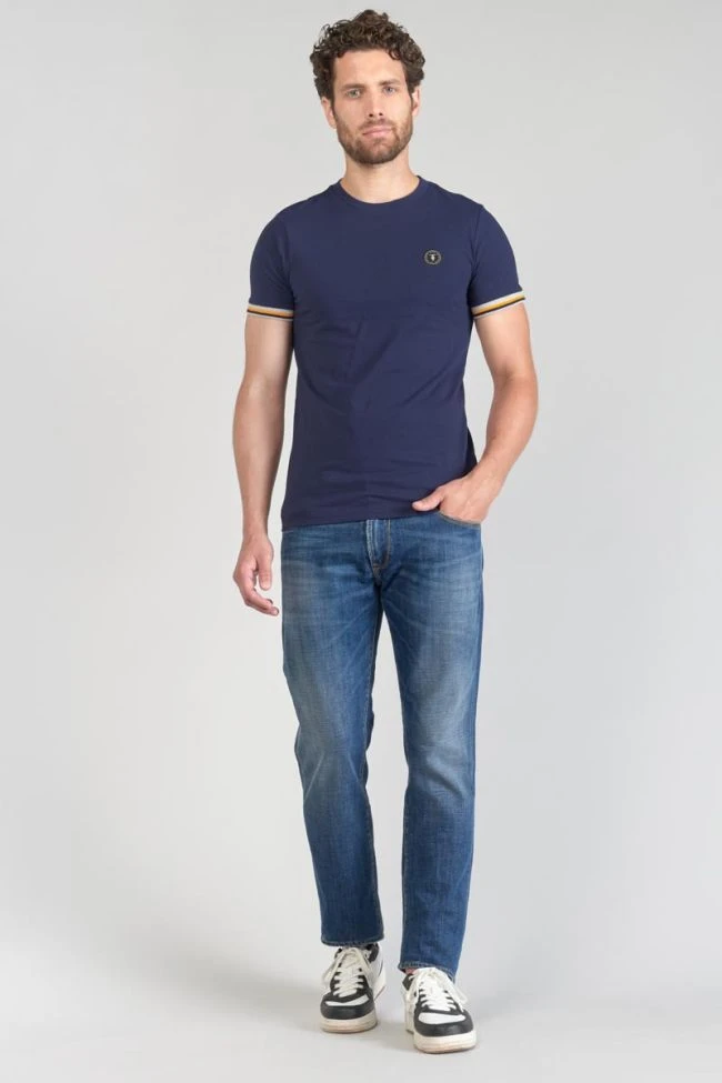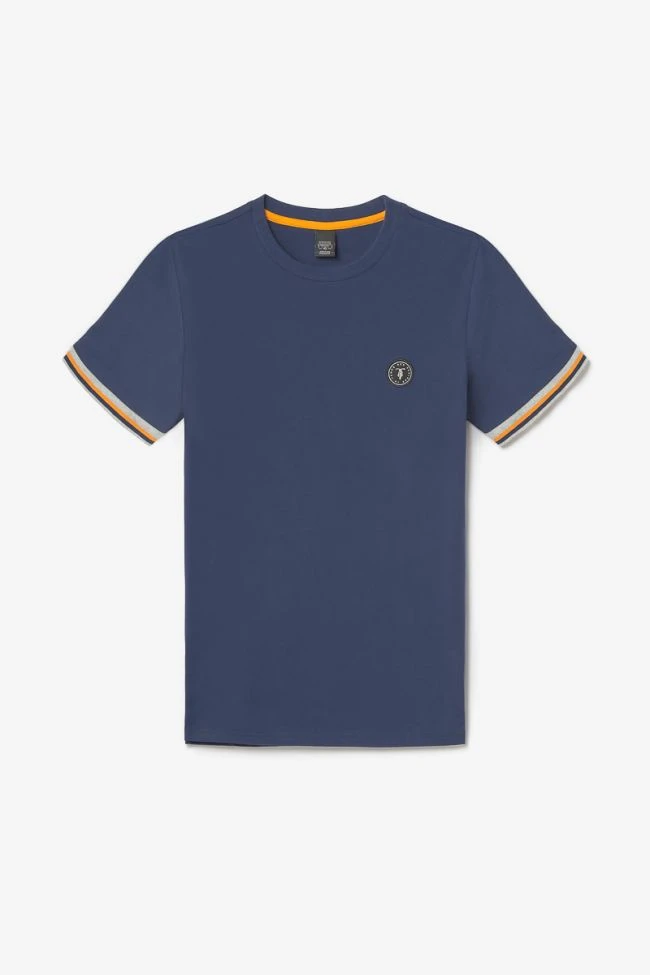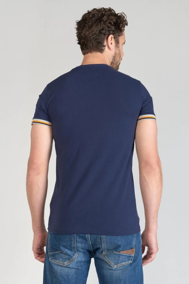 Ce t-shirt Grale allie à la perfection look casual avec son jersey bleu marine intemporel et look tendance avec son liseré gris et orange fluo au niveau des manches. Pour le détail, un écusson Le Temps des Cerises sur la poitrine.