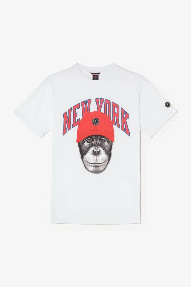 Ce t-shirt Hira blanc a un look casual avec son imprimé fantaisie dans les tons de rouge et bleu. Pour le détail, un écusson Le Temps des Cerises sur la manche gauche.
