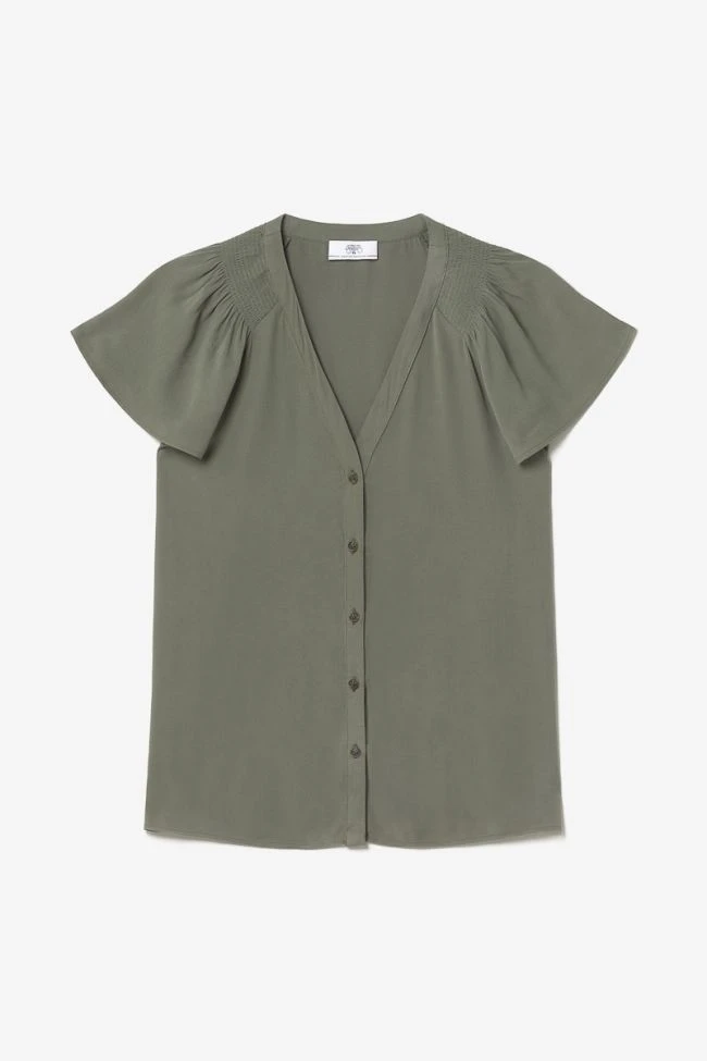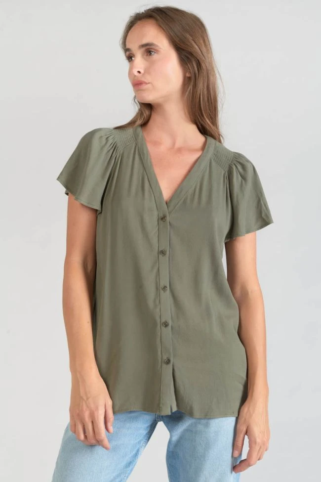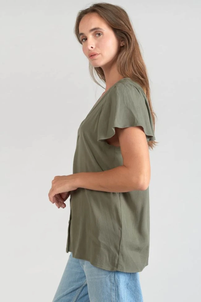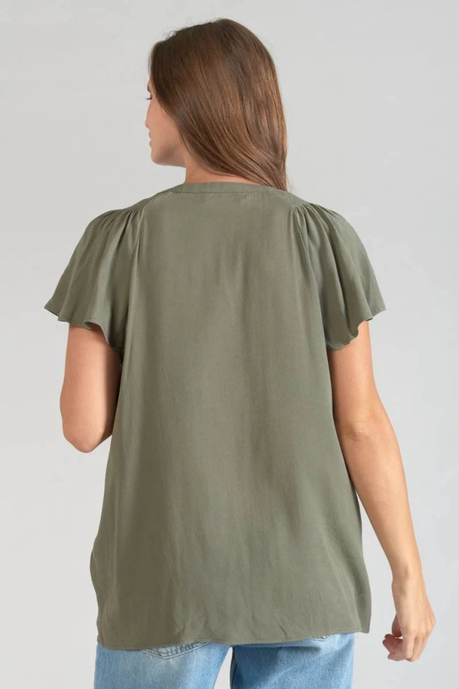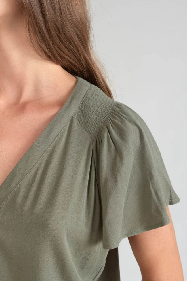 Ce top Aube en tencel kaki a un look casual féminin avec son col V et ses manches à volants avec épaules smockées. Son tissu doux et fluide est agréable à porter.
