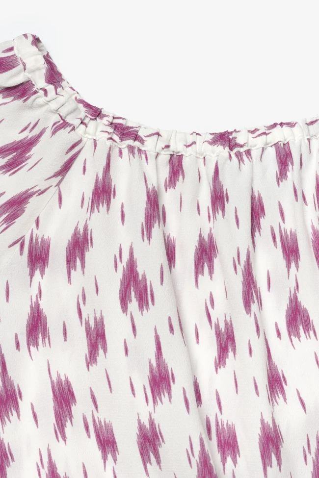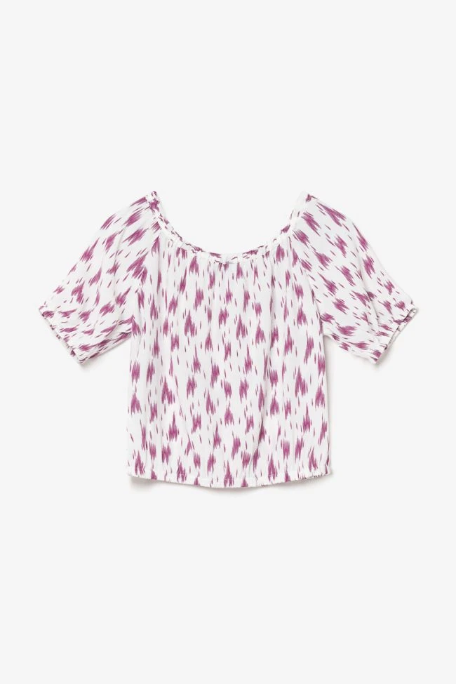 Joli top court Jilogi au motif violet très girly. Sa coupe élastiquée à la taille et aux épaules permet de porter le top épaules couvertes ou dénudées.