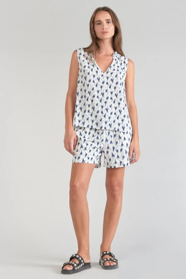 Ce top Rosita est idéal pour la saison estivale avec son tissu léger et son imprimé effet tie and dye bleu. Son col V habillé de petits volants apporte un côté féminin.
