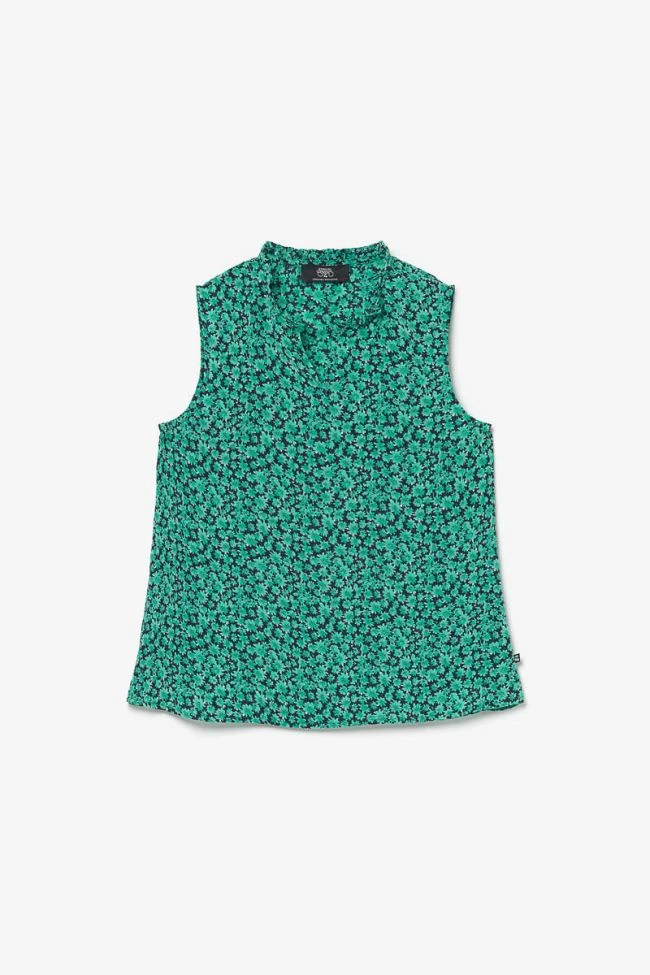 Top Safiyagi idéal pour la saison estivale avec son tissu léger et son imprimé à motif vert et bleu marine. Son col V habillé de petits volants apporte un côté girly.