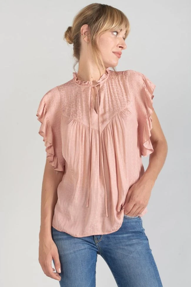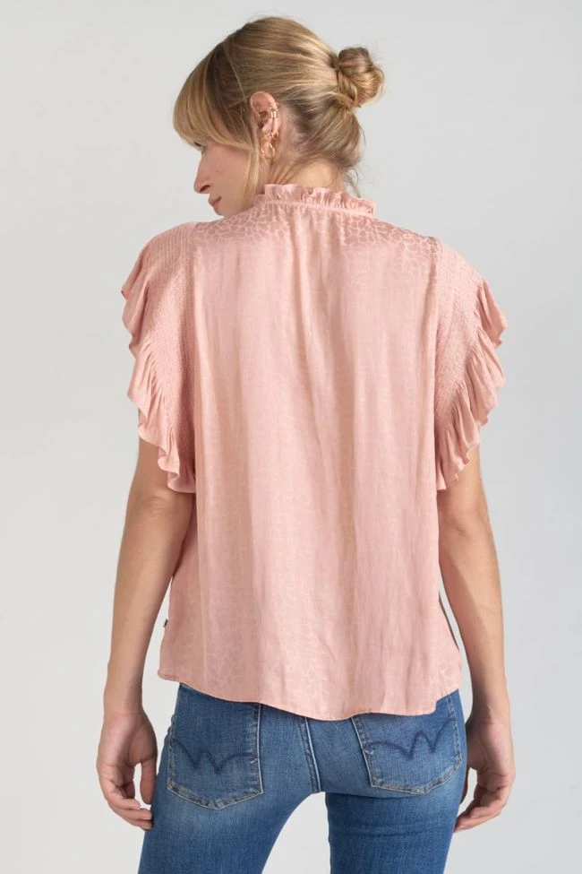 Ce top Theron rose saumon est très habillée et féminin grâce à ses multiples détails comme son jacquard à motif animalier, son col ruffle et ses emmanchures smockées à volants.
