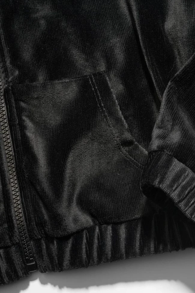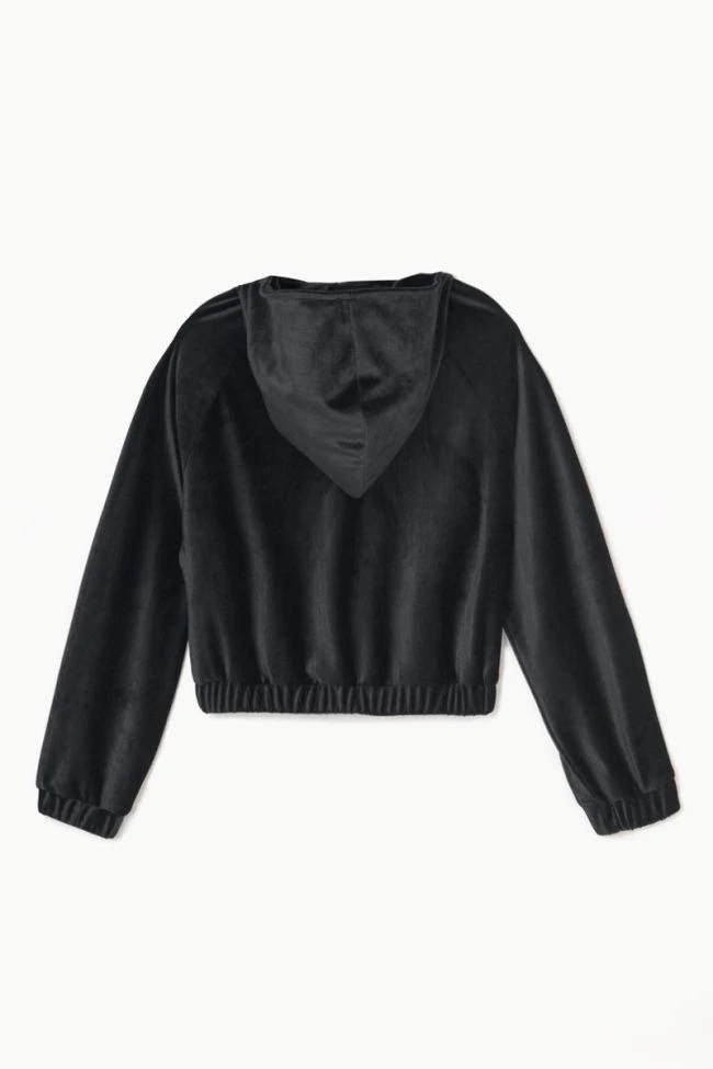 Veste zippée Zildagi noire au look sportswear avec sa capuche, sa coupe courte et sa fermeture zippée mais reste pour autant girly avec sa broderie argentée Le Temps des Cerises et son velours côtelé très doux et agréable à porter.